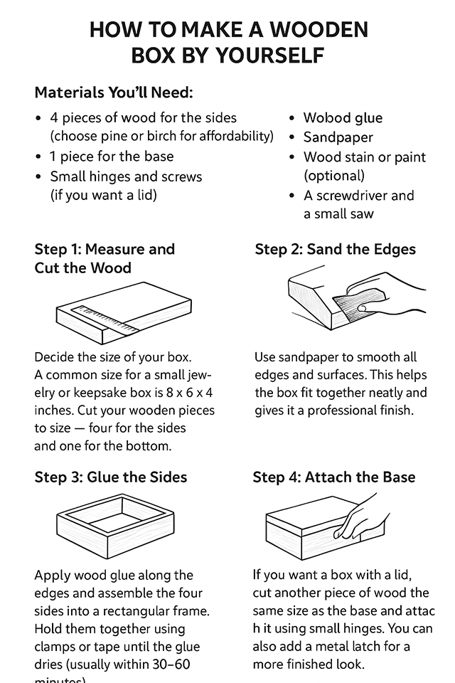 Making your own wooden box is easier than it sounds. You don’t need advanced woodworking skills — just basic tools, a few materials, and a bit of patience. Here’s a simple step-by-step guide for beginners.
